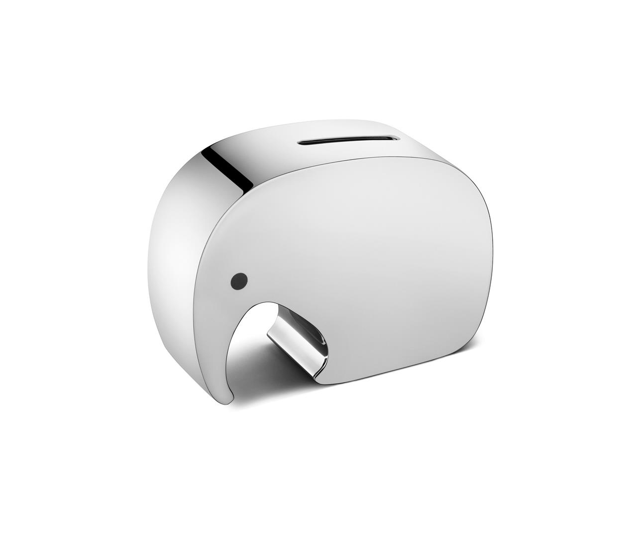 Der Miniphant, eine verkleinerte Version der klassischen Elefantensparbüchse des Industriedesigners Jørgen Møller, ist aus hochglanzpoliertem Edelstahl gefertigt und hat alle Eigenschaften seines legendären Vorfahren, des Moneyphanten.