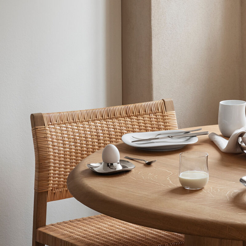 Eine fließende organische Scheibe scheint über dem Tisch zu schweben und in der Mitte aufzusteigen, um einen ungewöhnlichen und modernen Eierbecher zu bilden. Die aus Edelstahl gefertigten Eierbecher sind ebenso praktisch wie schön: der erhöhte Rand erleichtert das Tragen und auf dem breiten Untersetzer können während des Essens Eierschalen aufbewahrt werden.