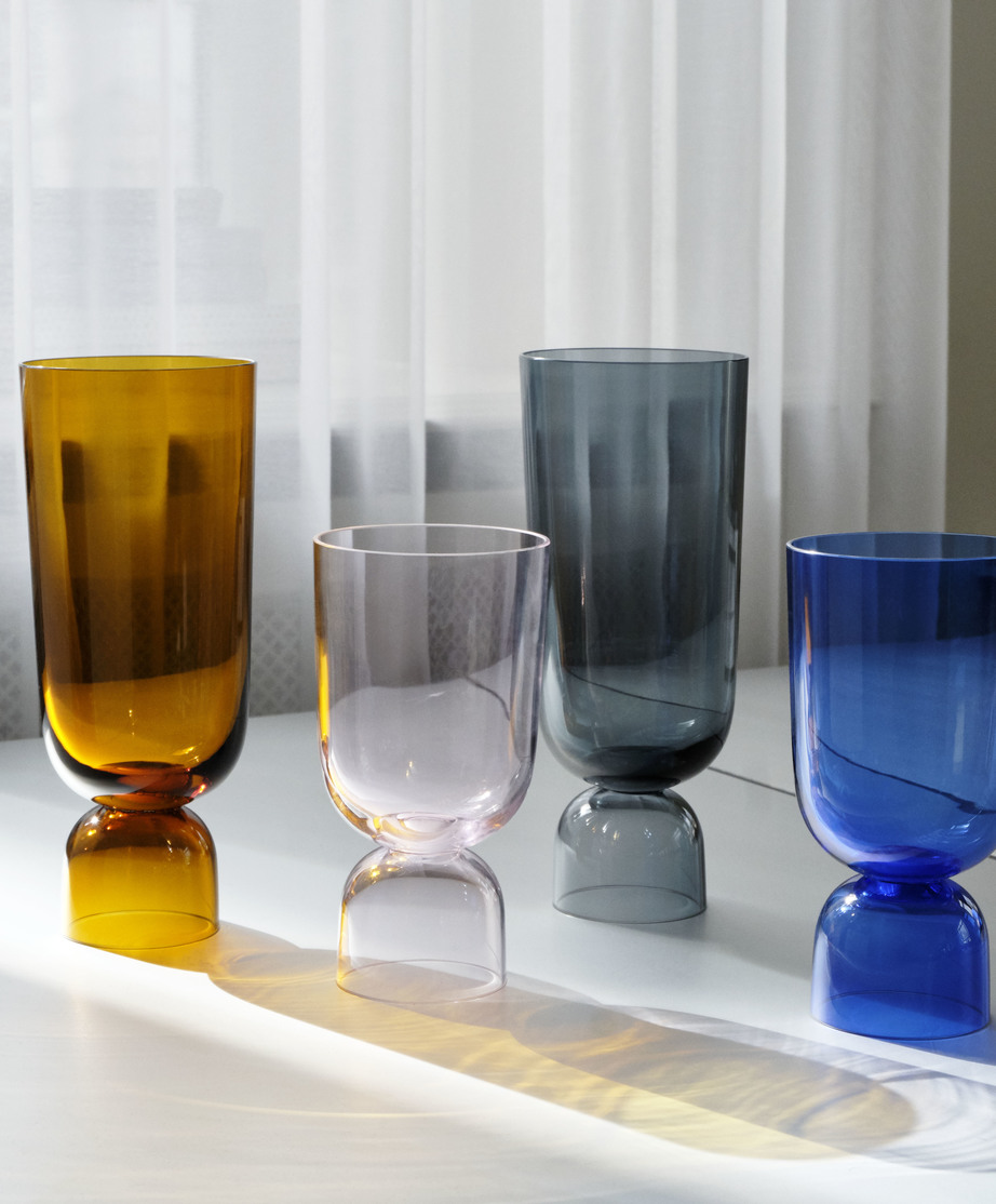 Die von Ingrid Aspen entworfene Bottoms Up Vase ist aus farbigem Glas gefertigt und verfügt über einen eleganten Hals, der auf einem gewölbten Sockel balanciert. Erhältlich in zwei Größen und einer Auswahl an Farben.